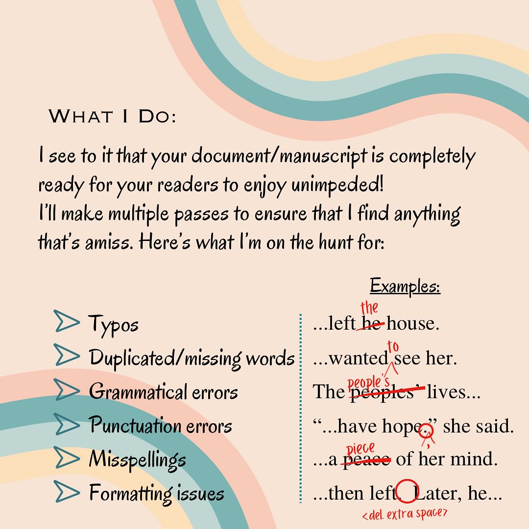 Proofreading is the last step before publishing so that any mistakes that were missed or introduced during the previous editing stages can be corrected. It primarily focuses on identifying and correcting errors in spelling, punctuation, and formatting.